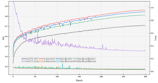 The IoU indicates the degree of overlap between the predicted region and the ground-truth region, and its mathematical expression is shown in Equation (14). Recall indicates how many true positive samples are successfully predicted as positive by the model, and its mathematical expression is shown in Equation (15). Precision indicates how many true positive samples are included in the positive category samples. Its mathematical expression is shown in Equation (16). The F1 score comprehensively considers both recall and precision, focusing on both accuracy and coverage. Its mathematical expression is shown in Equation (17):