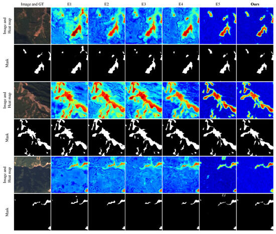 Figure 11b,c reveals the critical limitations of conventional methods in handling landslide discontinuities, where these architectures consistently misclassified fracture zones as landslide areas. Ours emerged as the sole framework capable of accurate fracture detection while maintaining high sensitivity to marginal landslide features in image peripheries, confirming its exceptional segmentation capability. As illustrated in Figure 11c,d, although all evaluated networks demonstrated basic localization competence for distributed landslide patterns, ours achieved superior shape fidelity and spatial consistency, producing segmentation results which most closely approximated ground-truth distributions.