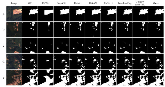Visualization results of comparative experiments of different segmentation algorithms. (top) Ours; LAN-UKAN with FTTL. (left) (a) Concentrated landslide areas, (b) relatively concentrated landslide areas with fractures, (c) fragmented and dispersed landslide areas, (d) dispersed landslide areas, and (e) complex interleaving of landslide and non-landslide areas.