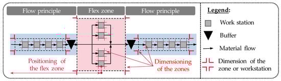 When using the term hybrid assembly, it is crucial to differentiate this term, as it also describes semi-automatic assembly as a combination of manual and automated assembly [12]. Although the degree of automation is a significant influencing factor when considering economic production, it should not be considered further in the context of the presented approach. This approach finds hybrid organisation structures in the form of a combination of two different principles, in this case, the flow principle and the job shop principle. Figure 1 shows a hybrid production structure that combines a flow line with a flex zone, which is organised according to the job shop principle. The dimensioning of all zones depends on the assembly operations of the products to be assembled, and the positioning of the flex zone depends on the assembly precedence relationships.