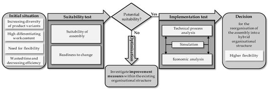 The presented approaches show that the choice of production structure is essential for production performance depending on the necessary flexibility requirements. While flow production can produce high volumes but can handle only limited variants, other production principles like job shop or cell production can handle many variants but cannot keep up with productivity. Regarding the logistical performance, the flow principle is convincing with high utilisation and short throughput times. In contrast, the job shop principle is more flexible regarding the product, the operating sequence, and the process times, but the logistical performance is worse due to longer throughput times and high WIP [9,18]. A comparison of the production principles shows that they fulfil different requirements. However, there is no selection procedure for choosing a suitable production structure based on flexibility requirements. There is no definitive scientific answer regarding when and under what conditions a hybrid organisation structure is appropriate [27]. Producing companies reaching their limits with their current structure of organisation due to the increasing flexibility required in assembly operations must consider changes to ensure long-term economic production. These can be implemented either gradually by optimising the existing system (first-order change) or revolutionarily by fundamentally redesigning the structures and assembly operations (second-order change) [28]. The transformation of assembly from the previous to a hybrid organisation structure impacts the design elements of technology, social factors, organisation and information in the assembly system. It can, therefore, be classified as a revolutionary change. Thus, before actual implementation, a sufficient examination is required to determine whether a hybrid organisation structure is technically and organisationally feasible and economically profitable. To determine the suitability of a hybrid organisation structure, support in the form of a process model has been developed, which is shown in Figure 2. It shows the two parts of the suitability analysis. First, a suitability test is to be carried out to determine the fundamental suitability of an existing assembly organisation for a hybrid organisation structure. The suitability test is based on a questionnaire that checks the suitability of the existing assembly organisation and its acceptance of change. The questionnaire is described in detail in [27]. The implementation test consists of two parts: technical process analysis and economic analysis, which are linked by a simulation. Following an iterative approach, a targeted decision can be made regarding dimensioning the hybrid organisation structure. The procedure for the technical process analysis of the implementation test is described in further detail in the submodels presented in Section 3.