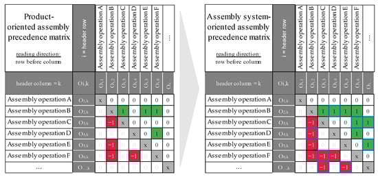 All influencing factors must be digitally processable to configure organisation structures with the approach presented. The assembly precedence matrix (APM) represents the precedence relationships between the individual assembly steps by comparing them in pairs and simplifying the data’s computer-aided processing in contrast to the assembly precedence graph [32]. Precedence relationships are coded as follows: ‘1’ indicates that the row operation must be performed before the column operation (green), ‘−1’ indicates that the row operation should be performed after the column operation (red), and ‘0’ indicates no precedence relationship (white) [32]. Since most assembly planning projects represent restructurings instead of new developments, it is crucial to identify the origin of the restrictions. These can come from the design of the assembly object or the assembly tools [33,34]. Figure 3 shows the APM description model as an example.