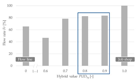 Substudy 1: This step examined the influence of the hybrid value PUDhy. In each run, the production programme and the scaling factor kflex remained the same. Figure 4 shows the flow rate for the different hybrid values PUDhy. When the hybrid value is 0, all assembly operations are included in the line. If the hybrid value is 1, all assembly operations are included in the flex zone so that it is a pure job shop. In this case, the high flow rate of 100% in the job shop does not correspond to reality due to the assumptions made in the simulation (Section 4.1). The assembly operations have different PUD values depending on the production programme. The PUDhy value determines which assembly operations are assigned to the flex zone and which are assigned to the line due to their high occurrence. A hybrid value 0.6 means that all assembly operations with a higher PUD than 0.6 are sorted into the line and those with a lower PUD into the flex zone. However, this means that assembly operations that do not occur in every product variant are scheduled into the line, so the line must have a longer cycle time. Accordingly, the flow rate here is also relatively low. With increasing hybrid value, the flow rate also increases since only the assembly operations that occur in most product variants and, therefore, have a high PUD value are scheduled into the line. The hybrid values PUDhy 0.8 and 0.9 have achieved a flow rate higher than 80% (blue box). The assembly operations and PUD values were analysed to select a suitable hybrid value. A hybrid value of PUDhy 0.8 was chosen because, at PUDhy 0.9, frequent assembly operations would be assigned to the flex zone. In summary, it can be concluded that a hybrid organisation structure can achieve a higher flow rate than a production line if the production programme is very complex with product variants in different quantities.