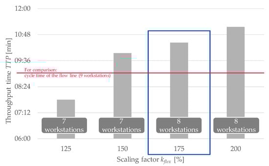 Substudy 2: The influence of the scaling factor kflex for the duration of assembly operations in the flex shop was examined in the next step. For this, 0.8 was used as a constant for the hybrid value PUDhy. Since the throughput time TTP also increases with an increasing scaling factor kflex, Figure 5 shows the throughput time TTP as the target variables. The scaling factor kflex was successively increased in the simulation runs, and accordingly, the throughput time TTP increased. The scaling factor kflex has already been entered into the decision model, which outputs the number of required workstations. If the scaling factor kflex is higher, the number of workstations in the flex zone has to increase accordingly. The results show that a further workstation is required from a markup of 75% and that eight workstations are required accordingly. This substudy shows the importance of the scaling factor kflex for real planning in industrial applications since the corresponding number of workstations must also be provided for the respective organisational principles, depending on the assembly times. The plausibility of the scaling with an allowance of 75% was confirmed by the real times of the practice partners.