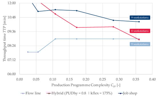 Substudy 3: After selecting the hybrid value PUDhy and the scaling factor kflex, the hybrid organisation structure was compared with the dedicated line and the dedicated job shop organisation structure. The performance of these organisation structures was examined under the assumption of changing production programmes. Figure 6 shows the results of the various simulation runs with different production programmes. With an increasing Cpp value, the complexity of the production programme increases. The target variables of flow rate and throughput time were evaluated; the throughput time is shown in Figure 6. It can be seen that the line achieves the lowest throughput time, whereas the hybrid organisation structure converges the line’s throughput time when complexity is high. In this context, it should be noted that the hybrid organisation structure achieves the same performance with lower capacities because it uses only eight workstations. When considering the line, it can be seen that at a certain level of complexity, the throughput time increases due to an increasing cycle time; correspondingly, the flow rate decreases with increasing complexity. By contrast, the flow rate increases for a hybrid organisation structure. Accordingly, the more complex the production programme in a line, the lower the degree of utilisation of the individual workstations. The hybrid organisation structure and the division of assembly processes into line and flex zone according to their frequency increase the degree of utilisation of the workstations and can even save capacity.