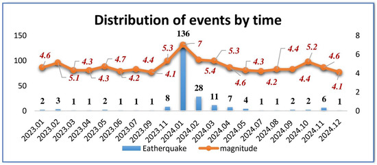 Figure 3) was constructed to visualize the temporal distribution of seismic activity over two years. It illustrates the monthly recorded earthquakes from January 2023 to November 2024. This visualization enables the identification of periods of increased seismic activity. The highest number of seismic events was recorded in January 2024 (136 events) and February 2024 (28 events), suggesting increased tectonic activity. In contrast, the number of earthquakes in the remaining months is significantly lower, indicating the irregular nature of seismic activity in the region.
