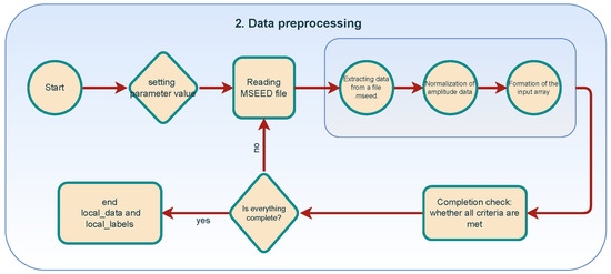 From the extracted seismic data, the signal amplitudes are isolated and subsequently normalized to eliminate differences in scale and enhance the stability of the model. Scaling the data reduces the influence of amplitude variations, thereby improving the model performance. Normalized data are used to construct the input array for the neural network. Following preprocessing, data integrity checks are performed. The extraction and normalization process is repeated if one or more criteria are not met (e.g., missing values or invalid data entries). Once all conditions are satisfied, the data are divided into two groups: Preprocessed input data array and corresponding class labels. After completion of the preprocessing stage, the data (