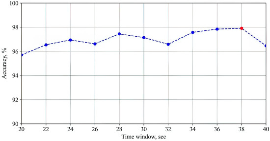 Figure 9 presents the relationship between the accuracy of the P-wave detection and the length of the time window. The blue dashed line represents the accuracy trend as a function of the time window size, while the blue markers indicate empirical values obtained from experiments. The red marker highlights the optimal time window length, which yields the highest detection accuracy.