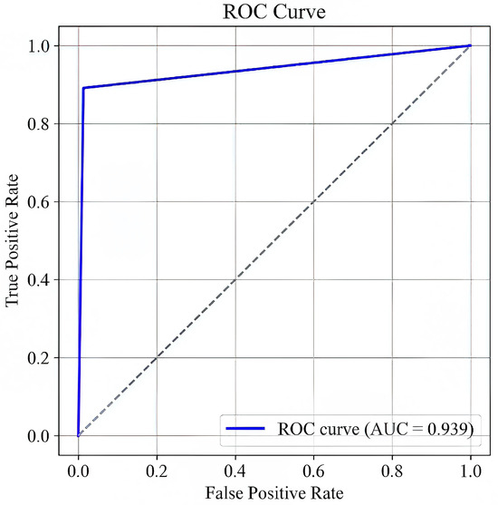Figure 10) was generated to evaluate the performance of the binary classifier. The blue curve represents the valid positive rate (sensitivity) as a function of the false positive rate, while the gray dashed line indicates the random classification baseline. The model’s area under the curve (AUC) score is 0.939, indicating high precision and strong discriminative capability in detecting P waves within seismic waveforms.