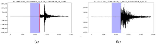 Figure 12). This approach provides a qualitative understanding of how the model detects P waves within the seismic waveform over time. The key moments of signal detection are highlighted on the seismograms. This visualization allows for a direct assessment of the model’s ability to pinpoint P-wave arrivals accurately, facilitating an intuitive evaluation of detection reliability and potential misclassifications.