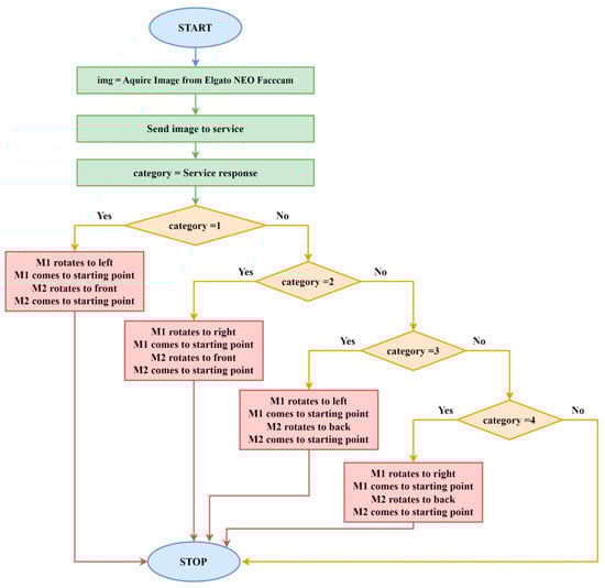 Figure 2 presents the block diagram of the category identification procedure. This flowchart describes the procedure for controlling the two NEMA23 stepper motors (M1 and M2) in response to a service’s classification result.
