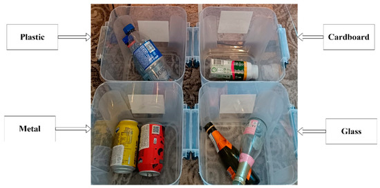 Figure 3 presents the four compartments corresponding to the glass, plastic, cardboard, and metal categories after extraction from the RBin using the evacuation flaps. Each compartment contains items that correspond to the specific material. For example, the plastic compartment holds plastic bottles, while the metal section includes cans and bottles made of metal. The compartments are detachable for easy emptying.