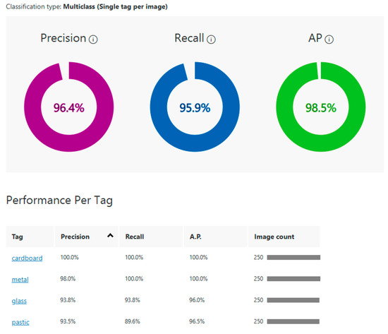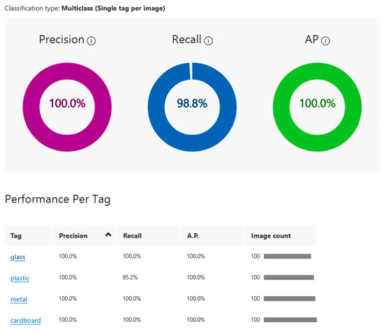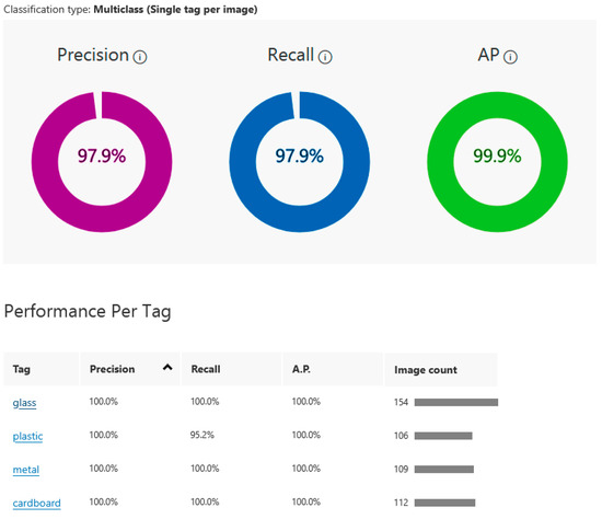- The first is a cloud-based pre-implemented classification algorithm represented by ACVS. This first methodology for implementing the automatic sorting algorithm uses a pre-implemented classification service from Azure Custom Vision, which performs training in the cloud. In this context, the model is customized through the perspective of the images used in training rather than by modifying the rules written at the code level. In other words, the service’s recognition capability directly depends on the images used for training. The programmer implementing the service in the custom RBin algorithm does not know the characteristics analyzed by Custom Vision. Therefore, the programmer cannot adjust the recognition capabilities of the service in any way. This lack of flexibility affects the long-term classification abilities of RBin.