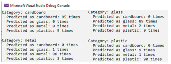 The methodology used for category identification employs ACVS. The training process begins with collecting labeled images representing different categories. The model classifies waste, so plastic, metal, paper, and glass images are collected and labeled accordingly. The labeled images represent the entire training dataset. The dataset is uploaded to ACVS for training. The biggest problem of the dataset is finding the optimum number of images for each category. The construction of the dataset must adhere to the following rules: