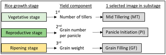 43]. Specifically, the correlation between reflectance and yield may vary with rice growth stages, summarized as intensive vegetative growth to produce fertile tillers, the process of panicle differentiation and flowering, and the accumulation of biomass in the grains, consuming the previous vegetative structures [