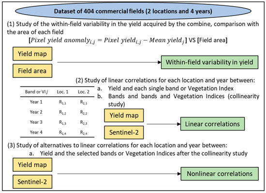 As a consequence, the central hypothesis of the present work is the existence of significant correlations between all Sentinel-2 spectral bands or VIs and yield variability for each growth stage within the field and for a broader data set representative of commercial fields spanning different years and locations. Four years of yield maps acquired by a combine harvester in 404 commercial fields (a total area of 706 ha) distributed in two Spanish locations (Valencia and Seville) were studied. We aim to study such correlations and the collinearity between bands and VIs, seeking the satellite data applicability to improve crop management. The results of the hypothesis would provide a source of information to ensure a more efficient implementation of Sentinel-2 in Spanish rice cultivation. Therefore, this work transfers the interpretability of the data rather than an empirical yield forecast.