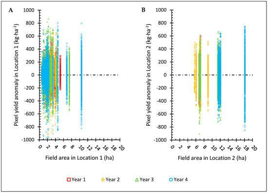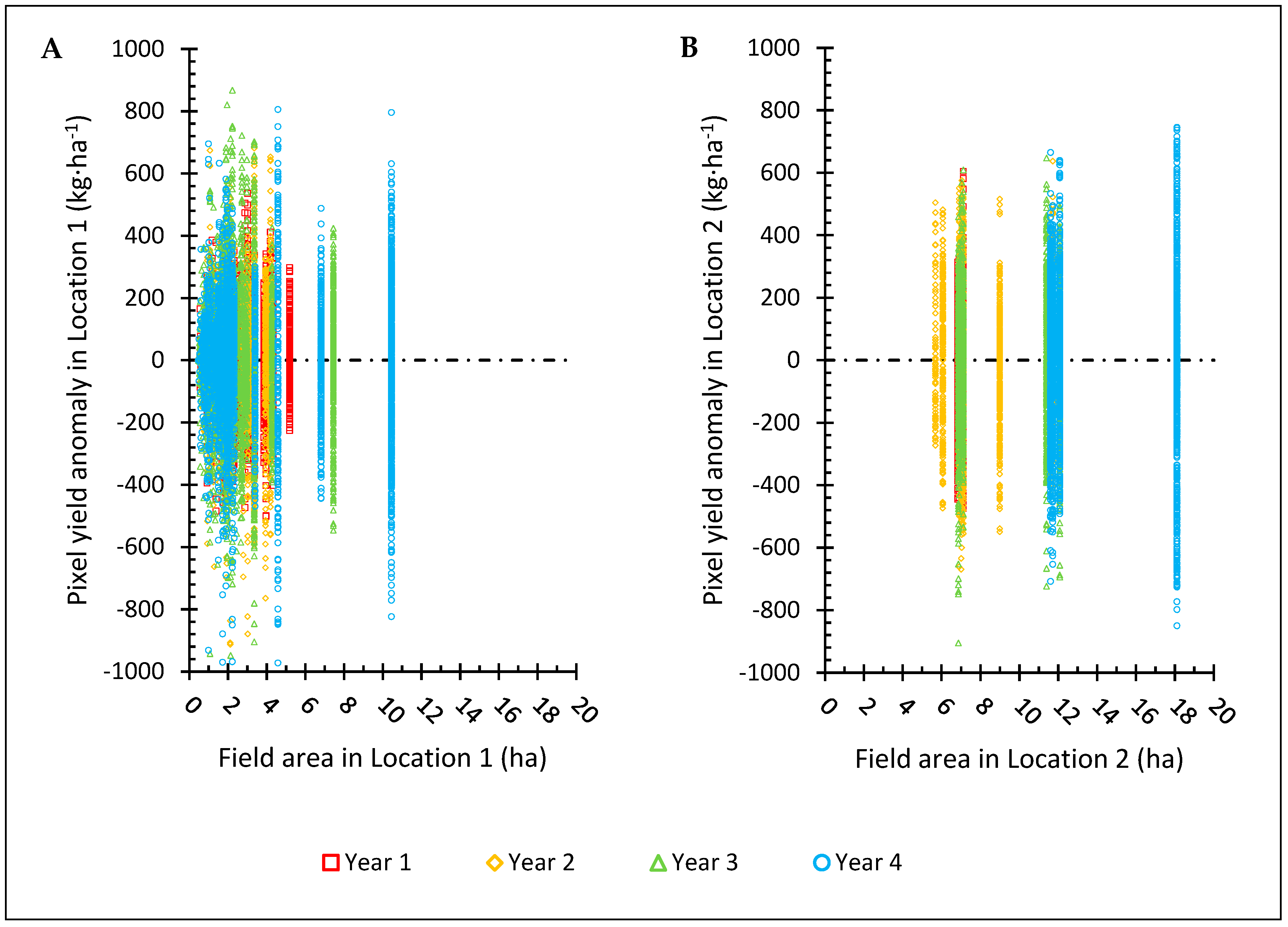 Section 1, the actual within-field yield anomaly provided the potential yield lost or gained compared to the average field. Few studies on rice cultivation analyze the actual within-field variability. Sarasso et al. [