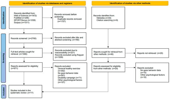 A total of 4487 studies were retrieved across the databases (Web of Science, PubMed, SPORTDiscus, and Scopus; Figure 1). In addition, 49 studies were identified via other methods. Following the removal of duplicate records (n = 1727), a total of 2760 studies remained for screening. In turn, 780 studies were excluded based on their title and abstract, and 1980 full-text articles were sought for retrieval. Of these, 221 records were inaccessible, and 1009 were excluded using Rayyan. A total of 971 studies were excluded based on full-text review. Consequently, 17 studies were included in the systematic review.
