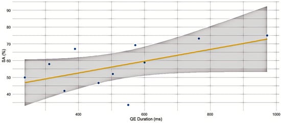 Scatterplot of correlation between QE duration and shooting accuracy (SA). Note: The yellow regression line represents their linear relationship, with blue dots as data points and the gray shaded area as the confidence interval (CI).