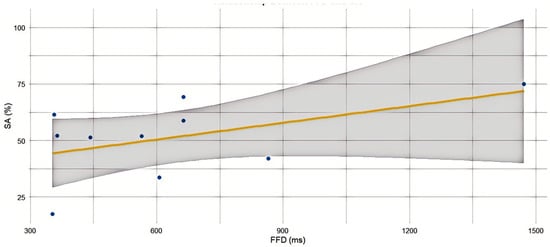 Figure 2 and Figure 3 illustrate positive correlations between QE duration and SA, as well as between FFD and SA. The correlation coefficient of 0.67 (p = 0.04 < 0.05; see Table 4) indicates a statistically significant positive relationship between QE duration and SA. Similarly, the correlation coefficient of 0.55 (p = 0.03 < 0.05; Table 6) confirms that FFD is also positively associated with SA.