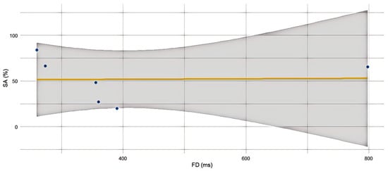 However, Figure 4 demonstrates a non-significant correlation between FD and SA. The plot shows no clear trend, with the fitted line remaining nearly flat, indicating that changes in FD do not substantially impact shooting accuracy. The correlation coefficient of 0.67 (p = 0.82 > 0.05; Table 6) further supports the absence of a statistically significant relationship between FD and SA.