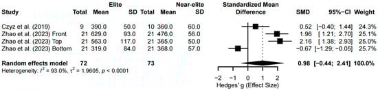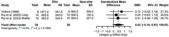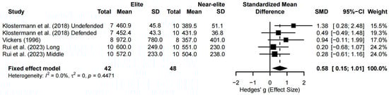 For QE duration, the results indicated a statistically significant difference between elite and near-elite athletes (p = 0.01, effect size = 0.58, 95% CI [0.15, 1.01]). The heterogeneity was low (I2 = 0%) and the Q-value (0, p = 0.4471) indicated consistency across studies.