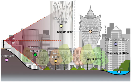 We categorized the main visual environmental elements seen from each observation deck. Buildings were classified based on height according to the latest version of China’s Unified Standard for Civil Building Design [25]. Buildings with heights not exceeding 27 m are low-rise buildings; those ranging from 27 to 100 m are high-rise buildings; and those taller than 100 m are super high-rise buildings. The landscape architecture views were classified based on the viewing targets, and the key environmental visual elements were summarized (Figure 2).