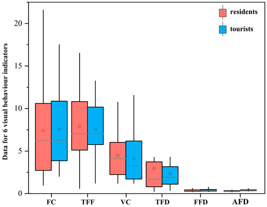 To explore the visual behavior characteristics of the residents and tourists in relation to AOIs in the images, several eye-tracking indicators were analyzed. Six were selected—total fixation time (TFD), fixation count (FC), time before first fixation (TFF), time to first fixation (FFD), average fixation duration (AFD), and view count (VC) [28] (Table 2). These metrics were used to identify the characteristics of viewer visual behavior toward visual elements of the urban overlook landscape.