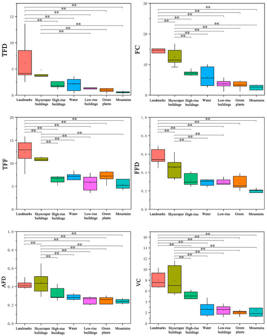 From the data in Figure 6, after examining the eye movement indicators of visual elements in various landscape architecture images viewed from observation decks, it becomes evident that a significant difference exists for TFD and AFD at the 0.01 significance level (p < 0.01); the FC, FFD, and VC indicators display a significant difference at the 0.05 significance level (p < 0.05). However, no significant difference can be observed in TFF (p > 0.05).