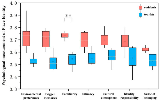The data in Figure 7 show that among the seven measurement indicators of place identity emotion for nine spots in the landscape architecture, the mean value of the resident group is greater than that of the tourist group. This indicates that the average value of residents’ place identity emotion relating to landscape architecture is higher than that of tourists. However, the independent samples t-test shows that the six place identity sentiment indicators have p-values > 0.05. That said, the familiarity index has a p-value of < 0.05, so there was a significant difference in the familiarity index in the place identity between residents and tourists in the process of viewing the same landscape, and there was no significant difference in other indicators. Although Hypothesis 2 is established, and residents have a higher sense of place identity than tourists, there is a significant difference only in the familiarity of place identity dimension.