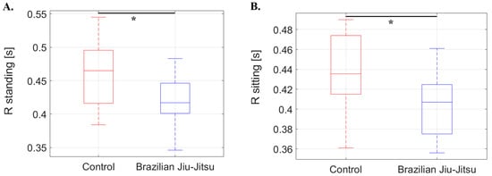 Box-and-whisker plots comparing reaction times between the control group and Brazilian Jiu-Jitsu athletes in two positions: (A) standing and (B) sitting. The middle line within each box represents the median. The upper edge of the box corresponds to the upper quartile, and the lower edge represents the lower quartile. The whiskers extend to the minimum and maximum values, excluding outliers, where: * denotes statistical significance p < 0.05.