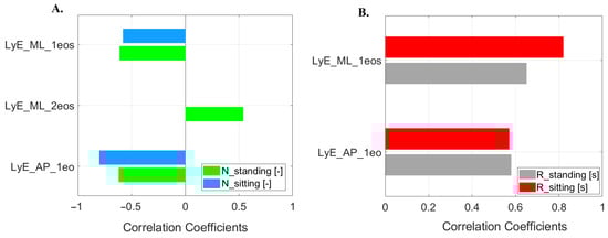 Positive correlations were observed between the reaction time (in both standing and sitting positions) and LyE_AP_1eo (R = 0.57, p < 0.05), as well as between LyECoP_ML_1eos and the reaction time (R = 0.64, p < 0.05 for standing and R = 0.81, p < 0.05 for sitting) (Figure 3B).