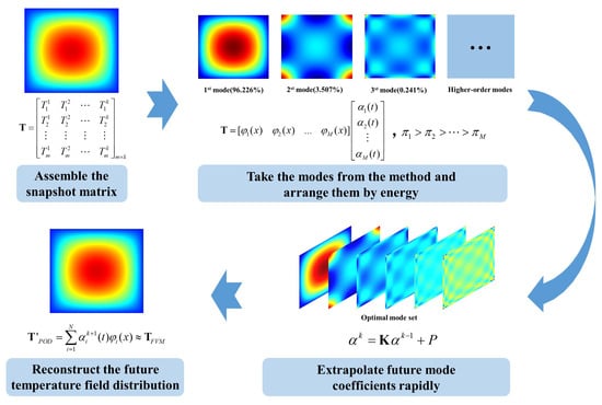 - Reconstruct the temperature field with Equation (1) to obtain the POD solution of the temperature field in the future.
