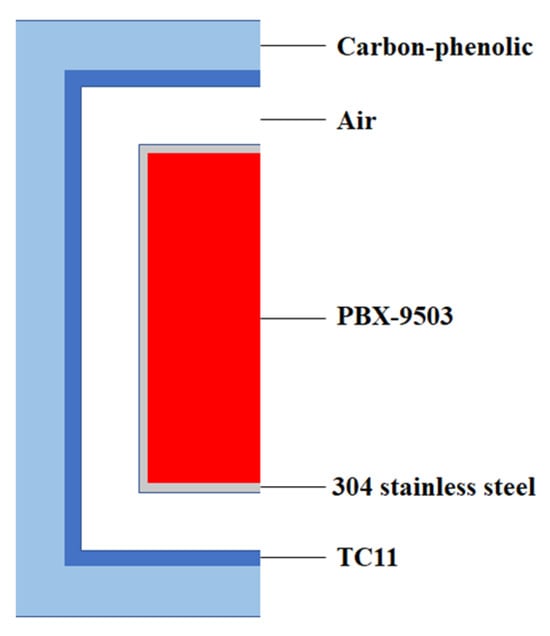 As shown in Figure 2, a complex structure with explosives contains five layers, in the order of a carbon-phenolic layer, TC11 titanium alloy layer, thick air interlayer, 304 stainless steel shell, and the PBX-9503 explosive. The thermal conductivities and the size of each component used in the numerical simulation are shown in Table 1.