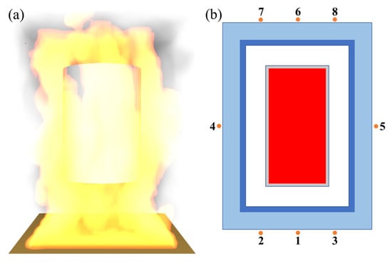 The coupled model and the locations of the measurement points: (a) the model’s structure, surrounded by the pool of fire; (b) the specific locations of the flame gas phase temperature measurement points are shown in points 1–8.