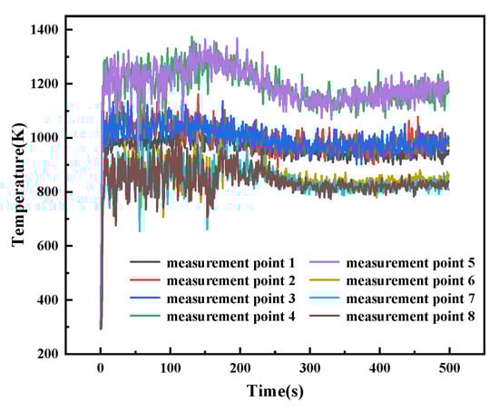 The results show that the flame temperature on the same surface of the structure is consistent; there is a great difference in the flame temperature on different surfaces, such as when, after 300 s, the temperature of measurement point 4 is 350 K higher than that of measurement point 6.