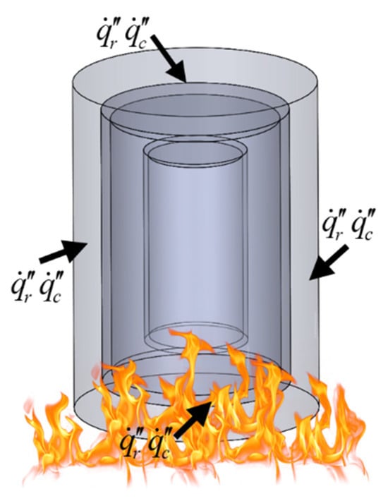 where represents the gas phase temperature of the flame, represents the temperature of the outer wall of the structure, is the convective heat transfer coefficient, is the Steffen-Boltzmann constant, is the angle of view coefficient, and and are the emissivity of the flame flue gas and the wall of the structure, respectively.
