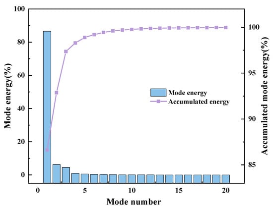 Then the matrix (17) was decomposed and a total of 500 POD modes and their eigenvalues were obtained. The POD modes can be arranged according to the energy determined by the eigenvalues. The percentage of energy of each POD mode can be calculated according to the following formula: