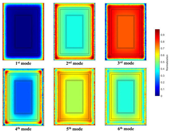 Figure 7 shows the 500th second normalization temperature of the structure, extracted from the first six POD modes. It can be seen that the first mode, which occupies the main energy, basically reflects the temperature field trend. Low-order modes with less energy constantly modify the boundary and the overall temperature field value within a small range.