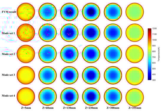 The key thermal indicators of a structure with explosives are temperature and explosion time. Figure 8 shows the temperatures of the cut surface of different mode sets after 1500 s. Except for the Z positions of 5 mm and 355 mm for mode set 1, the other mode sets have similar temperatures to the FVM result and show good agreement across all the cuts. This is due to the inability to capture slight energy thermal field trends in the case of low mode sets. As a result, the high-temperature areas are additionally highlighted. The deviation is gradually eliminated as the number of mode sets increases. From the temperature of the cut surfaces, the comprehensiveness of the thermal field in the extrapolation results of the algorithm can be demonstrated.