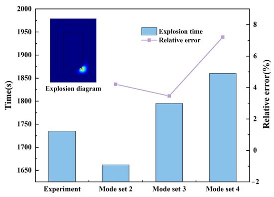 By harnessing the POD-FVM reduced-order extrapolation method, the precise moment of detonation is swiftly forecast. Mode sets 2, 3, and 4 accurately predict the explosion time, whereas mode set 1 does not. Figure 9 compares the explosion time predicted by the reduced-order method with the experimental data and delineates the relative errors for the various mode sets. Among the four mode sets, mode set 3 achieves the lowest relative error at 3.46%, with the maximum error remaining below 10%. This evidence supports the conclusion that the reduced-order model accurately predicts the explosion time. Moreover, the analysis indicates that the limited number of snapshots hinders the method’s ability to accurately capture the strong nonlinear heat transfer processes inherent in the explosion. This insufficiency results in the excessive smoothing of localized hot spots within the explosive material, ultimately causing mode sets that incorporate more modes to predict a delayed explosion time.