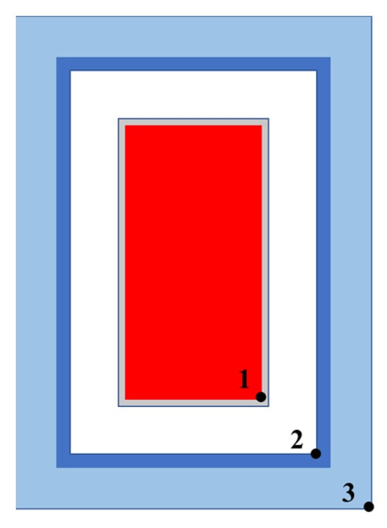 The analysis in Section 3.2 and the simulated explosion time results show that the temperature change on the facing-fire surface of the structure is much more drastic. Specifically, the temperature change at the junction of the facing-fire surface and the side of the structure is critical and will reflect the detonation point of the explosive. Therefore, in order to further analyze the temperature field in each layer of the structure, three representative points are selected. Figure 10 shows the location of these three points.