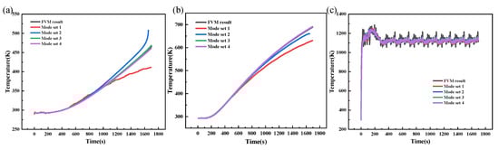 The temperature of different points under each mode set in comparison with the FVM result: (a) temperature at point 1, (b) temperature at point 2, and (c) temperature at point 3.