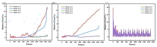 Figure 12 shows the relative error curves of each point with Equation (19). The results reveal that the relative error of mode set 1 and mode set 2 are larger than for mode set 3 and mode set 4 at point 1 and point 2. Notably, the errors accumulated gradually increase with time. The maximum relative errors of mode set 1 and mode set 2 reach 11.84% and 11.53%, respectively, at point 1. At point 2, the values drop to 8.46% and 3.43%. Moreover, there is a huge shift in the upward trend of the error of mode set 1 and mode set 2, rising at point 1 and point 2 when the time exceeds a time point. For example, the error of mode set 1 at point 1 shows a steep rise after 1000 s. However, at point 3, all four mode sets show good prediction ability, except in the early stages, where the relative error reaches 19.7%. A comparison study of the temperature data in Figure 11 reveals that this is due to the error introduced by the nature of the POD algorithm, namely, that the POD algorithm captures the main trends.