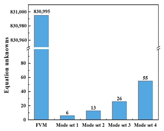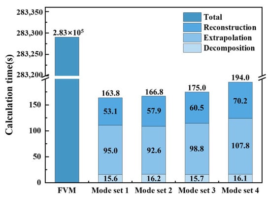 The degree of freedom of the system of algebraic equations determines the calculation speed. Figure 14 shows the total time for calculating 1500 time steps by FVM and the reduced-order method for each mode set. The POD reduced-order time is divided into three parts: the POD decomposition time of the temperature snapshot matrix (decomposition), the time of mode coefficient extrapolation (extrapolation), and the time of reconstruction of the future temperature field (reconstruction).