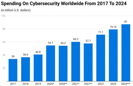 Global cybersecurity spending from 2017 to 2024. * Preliminary data, ** Estimated values, *** Forecasted data.