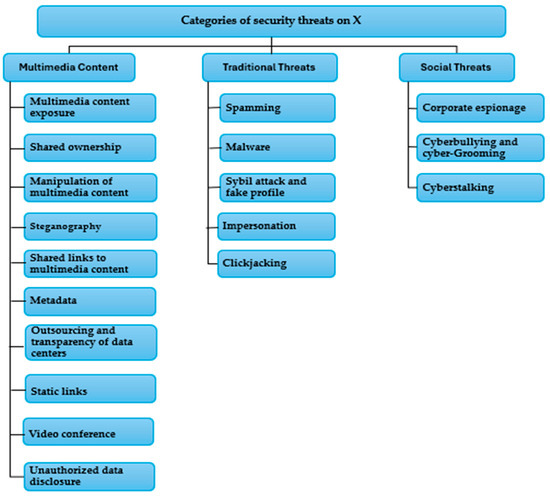 X, with its various features such as tweets, video and image sharing, and e-commerce capabilities, has become an integral aspect of the daily routines of a vast number of internet users. However, this widespread utilization of the platform also exposes individuals to a plethora of cyber threats and security concerns. The following section will outline these potential threats. As illustrated in Figure 2, there are several categories of security threats on X.