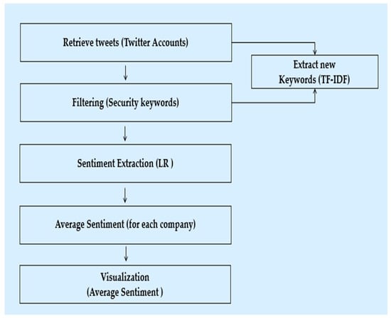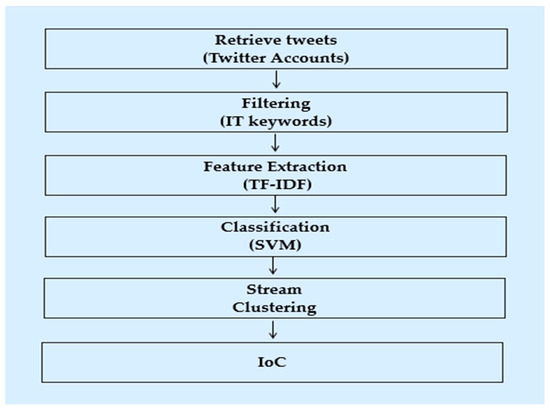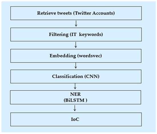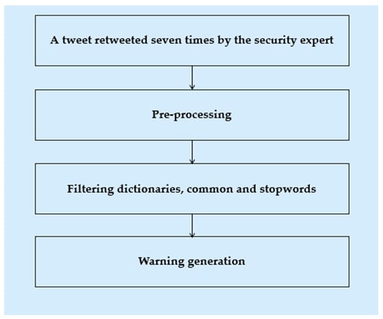 - Mittal, S.; Das, P.K.; Mulwad, V.; Joshi, A.; Finin, T. Cybertwitter: Using twitter to generate alerts for cybersecurity threats and vulnerabilities. In Proceedings of the 2016 IEEE/ACM International Conference on Advances in Social Networks Analysis and Mining (ASONAM), San Francisco, CA, USA, 18–21 August 2016; pp. 860–867. [Google Scholar]