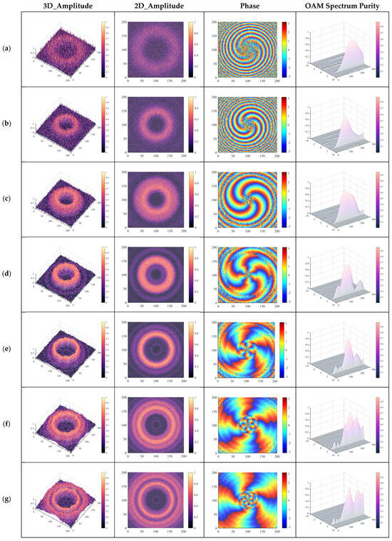 When the observation surface is positioned at a distance of 1.2 m from the metasurface, the noise amplitude is set as amp = 25. The sampling surface dimensions in Figure 5a,b are 1.407 m × 1.407 m, while those in Figure 5c–g are 1.005 m × 1.005 m. In contrast to Figure 4, it is slightly closer to the metasurface and has a larger noise amplitude setting, whereas Figure 5 has a smaller noise amplitude setting. As depicted in Figure 5a,b, both the 3D and 2D amplitude diagrams reveal that the small metasurface is overwhelmed by noise. The phase diagram also indicates the excitation of the vortex wave with l = −5 mode; however, due to significant noise interference, it becomes challenging to obtain an effective phase for this vortex wave on the submerged sampling surface area. The large metasurfaces shown in Figure 5c–e, with R = 40 × p, R = 60 × p, and R = 80 × p, respectively, exhibit good isolation of the electric field amplitudes from noise disturbances, as evident from both the 3D and 2D amplitude diagrams. The phase diagram further demonstrates the excitation of the vortex wave with l = −5 mode for these large metasurfaces; moreover, as the metasurface size increases, the area of the vortex phase on the sampling surface gradually expands toward obtaining a vortex phase within a central quarter area (3.14 × R2/4). The ultra-large-scale metasurfaces illustrated in Figure 5f,g generate multi-circle vortex wave amplitudes while effectively isolating them from any interfering noises. The phase diagram reveals the successful acquisition of vortex phases without any interference across all sampling surfaces for the ultra-large-scale metasurfaces shown in Figure 5f,g. Finally, in Figure 5, the OAM spectral mode exhibits high purity unaffected by Gaussian noise.