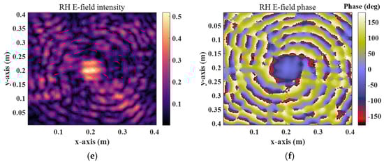 The design simulation of a 40 × 40 rectangular metasurface vortex wave in the full-wave simulation software is illustrated in Figure 12. The design mode is l = −5 and the incident wave is circularly polarized. The calculated frequency is 12 GHz. Figure 9a displays the OAM spectrum observed at z = 120 mm. It can be observed that LH = −5 dominates as the main polarization component, while RH right-hand circular polarization remains low as a cross-polarization component. A high-purity vortex wave with mode LH = −5 is generated, exhibiting a maximum electric field amplitude of 1.81 V/m in Figure 12b. Figure 12c,d depict the calculated ring-shaped intensity of the left-polarized electric field and five-period helical phase, respectively, confirming that the metasurface generates an expected mode vortex wave characterized by a regular ring-shaped electric field amplitude. Figure 12e,f present both the intensity and phase of the calculated right-handed polarization electric field, demonstrating sufficiently low undesired right-handed circular polarization amplitudes and verifying the high conversion efficiency achieved by the designed metasurface.